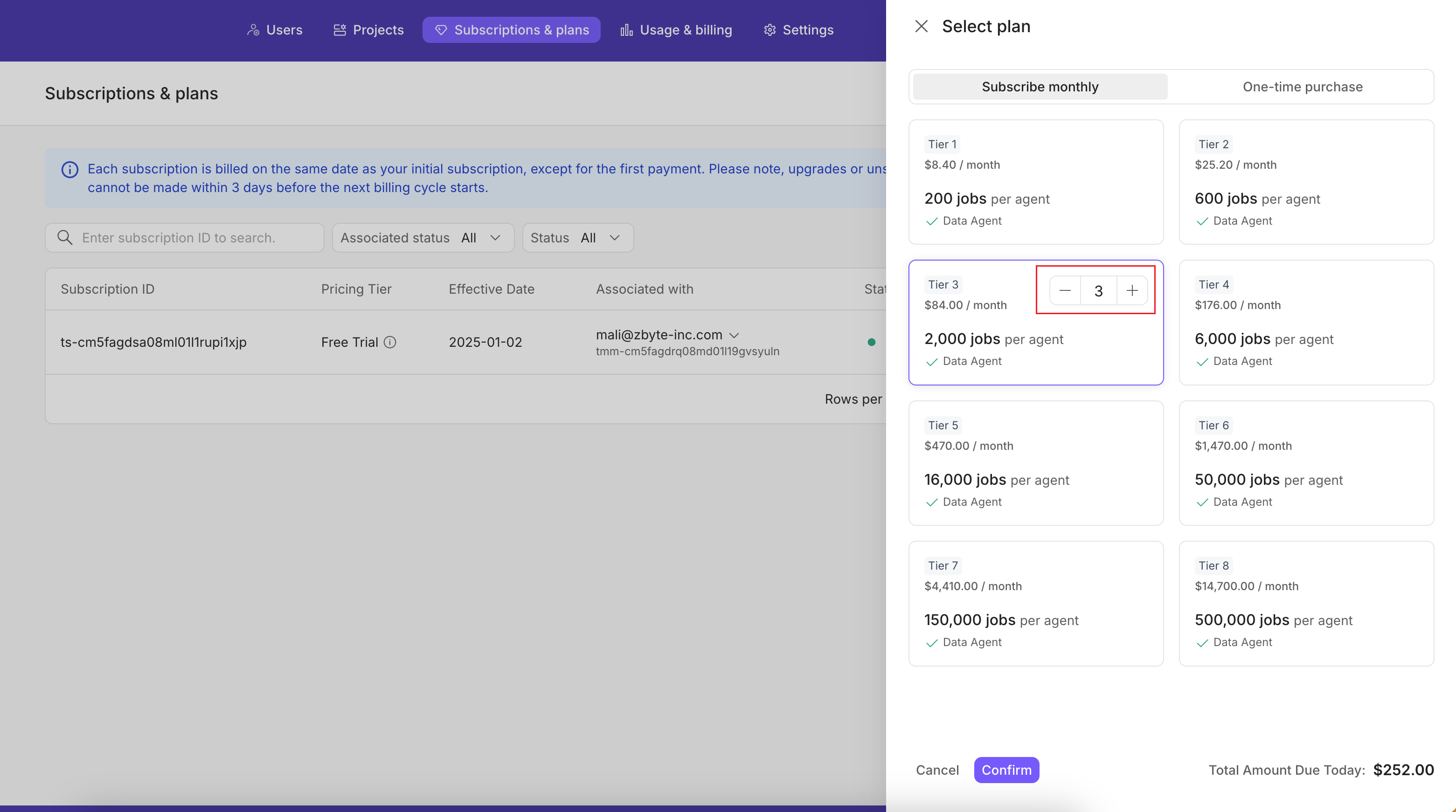 On the Select plan page, choose the subscription type, select the plan, and set the number of subscriptions you want to make, and click Confirm.