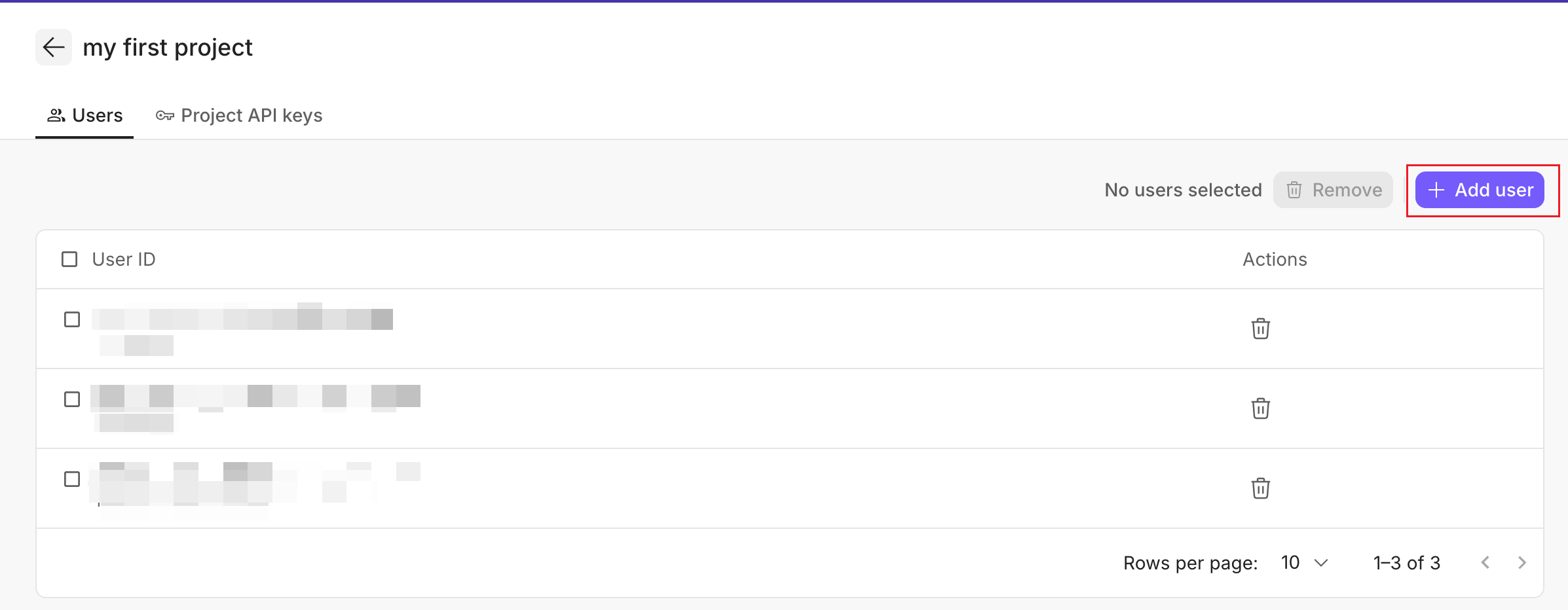 - On the Users tab of the project details page, locate the user you want to remove and click the Delete icon in the Actions column.