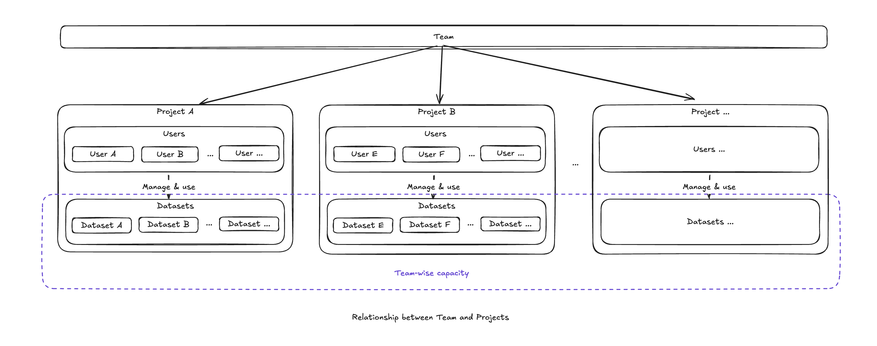 Projects are focused, purpose-driven groups within your organization. You can create multiple projects based on your specific needs. While all projects share the same pool of Workspace capacity, each project functions as a data-isolated environment. This means datasets created in one project are inaccessible to other projects, enabling you to maintain granular control over data security and ensure clear boundaries between projects.