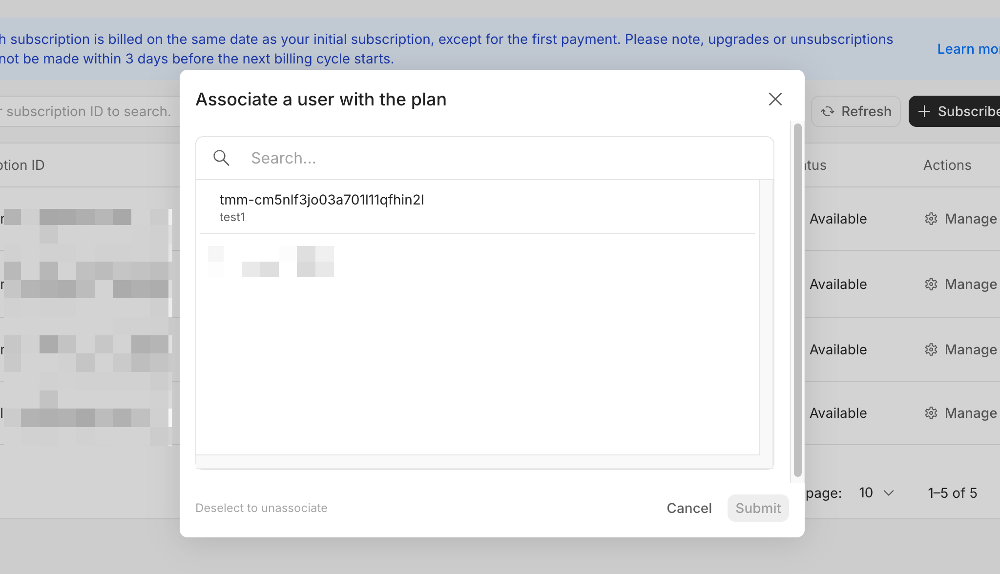 - Unsubcribe: Cancel the supcription. Unavailable for the free plan subscription and one-time purchase.