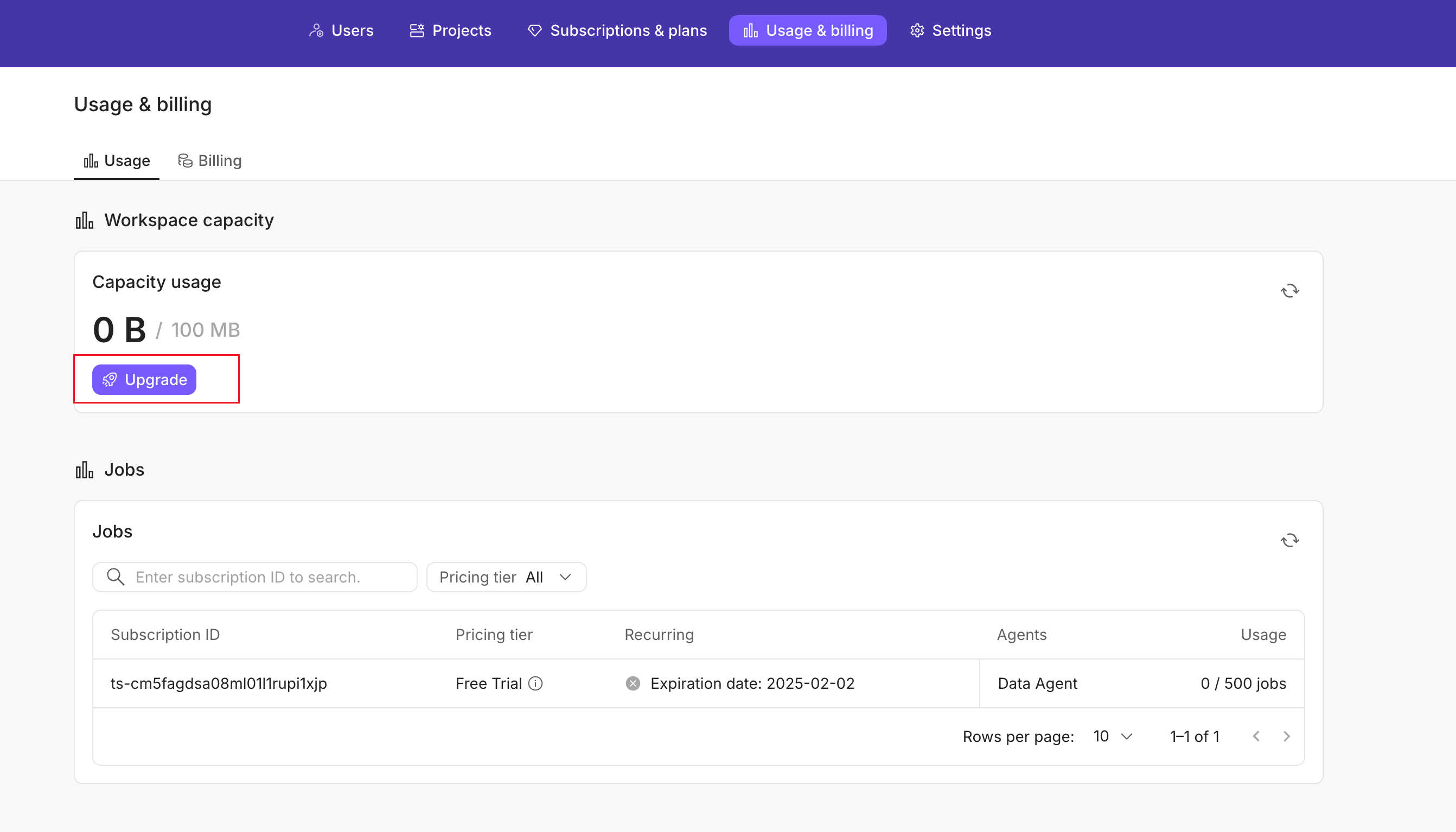 You can manage your subscription to Workspace capacity plan on the Usage & billing page. When your Workspace capacity is insufficient, you can:- Click Subscribe in the Workspace capacity section to choose a paid plan.