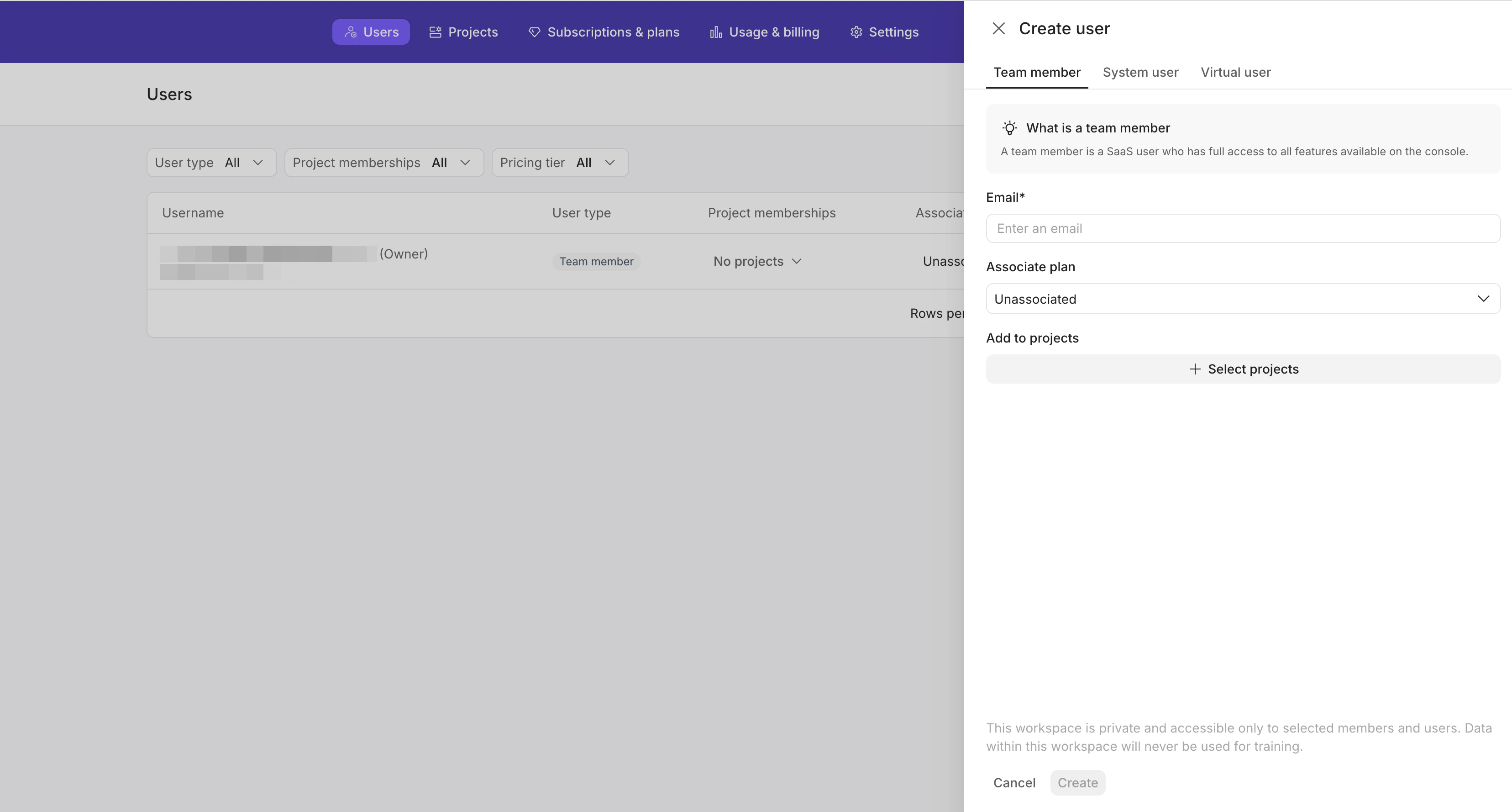 Parameter Required Description Email Yes The email address of the invitee. Associate plan No The subscription ID the user will be associated with. Only users associated with a plan can run jobs. Add to projects No Select the projects you want the user to join. Users can perform operations only in projects where they hold membership. If you create a team member, you can view the user information only after the invitee accepts your invitation.