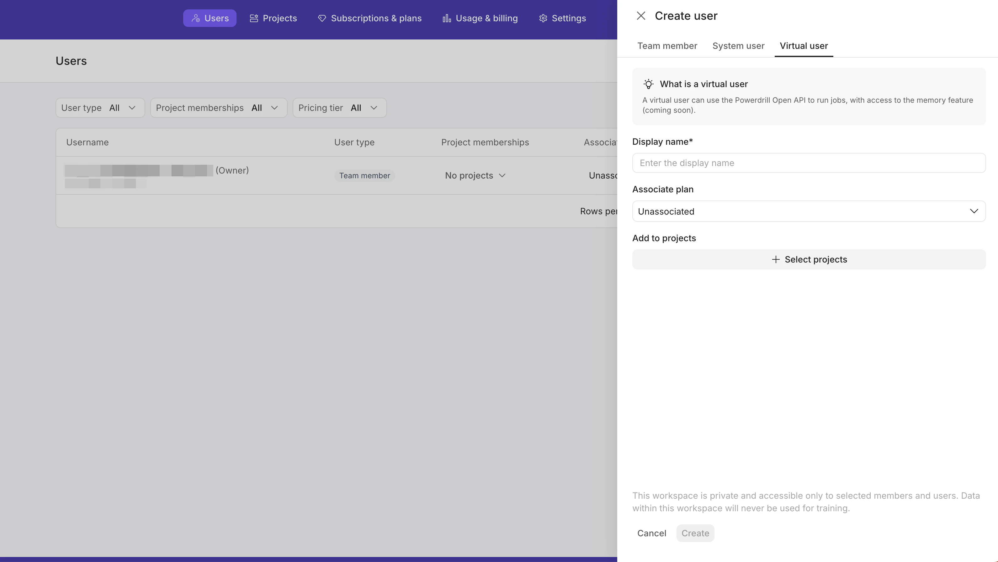 - Virtual users: A virtual user can use the Powerdrill Open API to run jobs, with access to the memory feature.