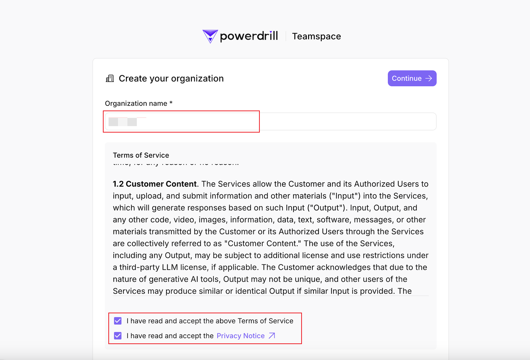 Enter your organization name, agree to the Terms of Service and Privacy Policy, and click Continue.